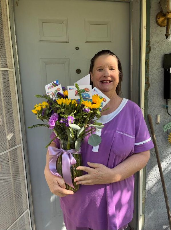 Darlene really wanted groceries but if she could wish for anything else it would be to look out her window in a swivel rocking chair. The last year has been difficult, and she thought the rocking motion would be soothing for her. Because of your generosity, Silver Wishes able to give her both. Thanks to Fleur de Lis Farm, her wish was completed with a beautiful bouquet of flowers.