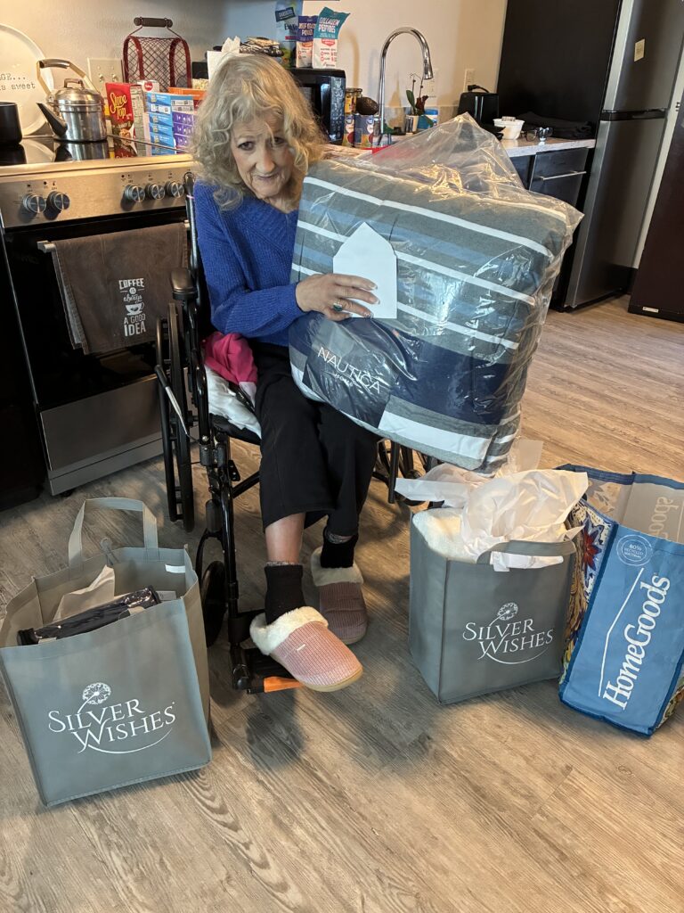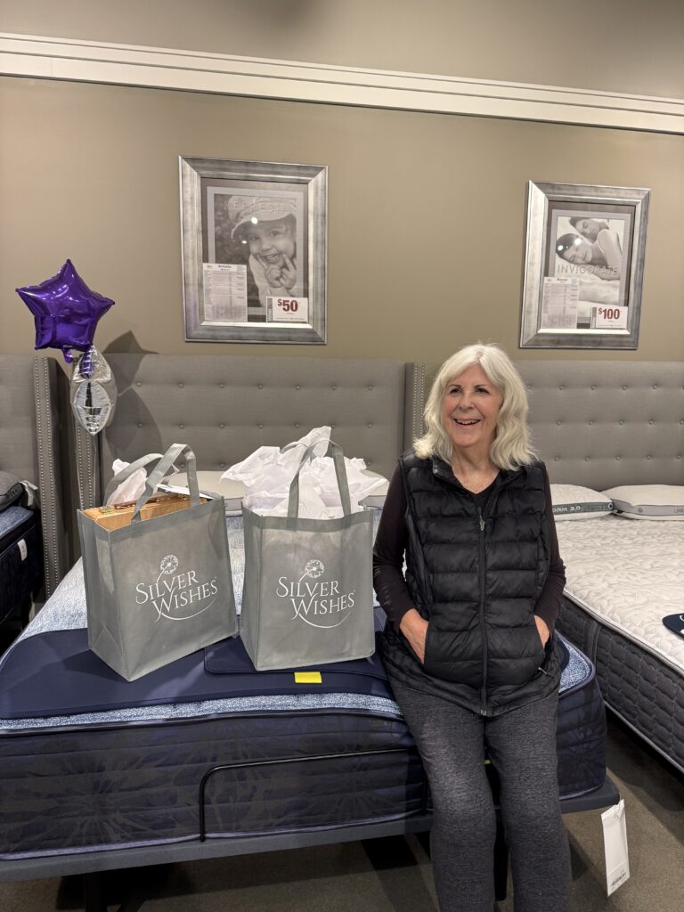 After Gail’s ceiling caved in due to too much water collecting on the roof, her spirits were running low. When Silver Wishes volunteers delivered her a Christmas tree, they listened to her story—and asked what her one-time wish would be. Gail wished for a new couch. With your support and help from RC Willey, Gail was able to shop alongside our volunteers and choose one herself. She shared, “You being with me today was exactly what I needed to lift my spirits and remind me just how blessed I am.” Moments like these are why we do what we do—bringing comfort, hope, and joy to seniors when they need it most.